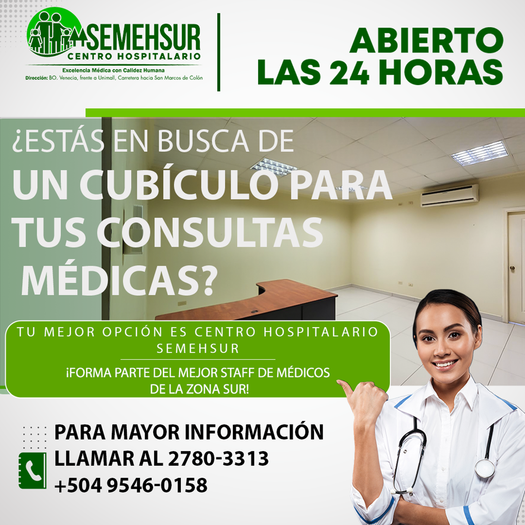Si desea conocer más sobre los consultorios disponibles, requisitos o tarifas, puede comunicarse con nosotros a través de: